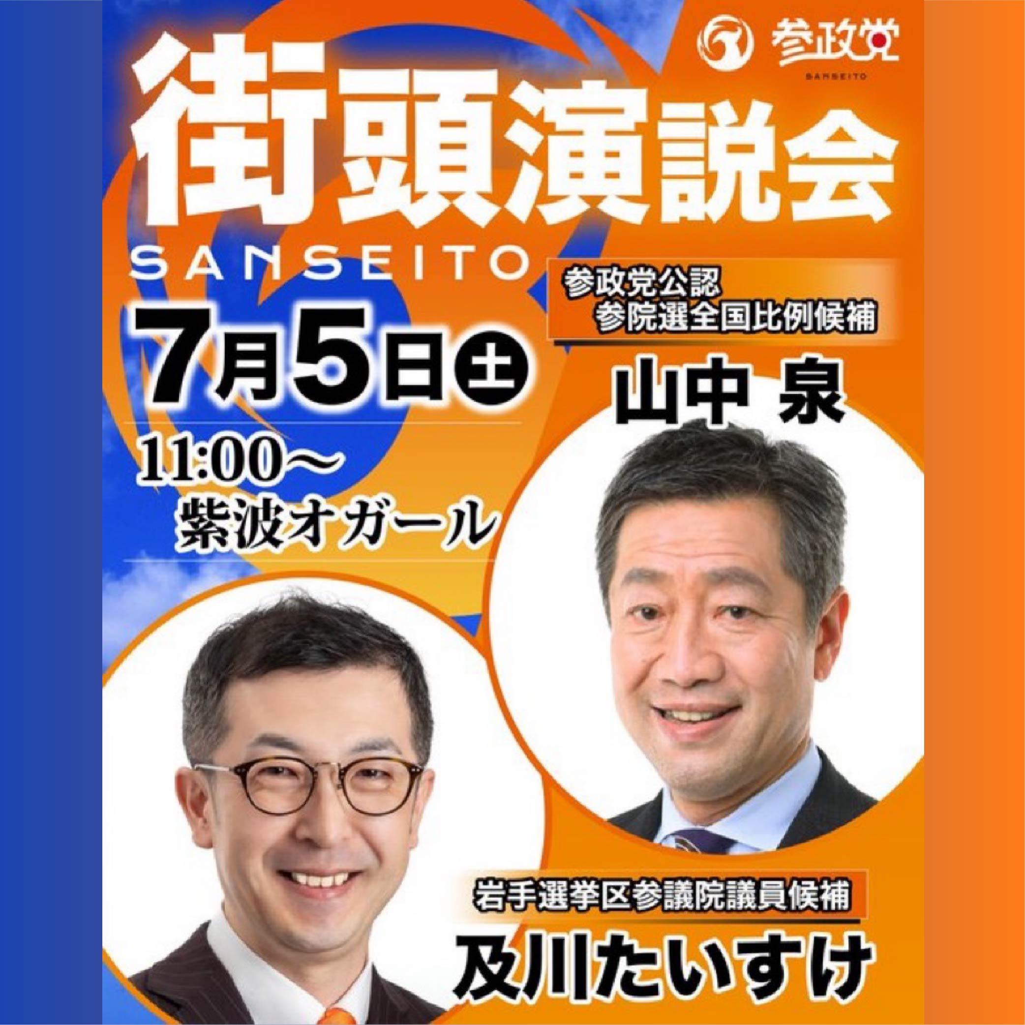 個人演説会 18:30~ 会場:プラザおでって 大ホール 弁士:及川たいすけ(岩手選挙区参議院議員候補)、山中泉(参院選全国比例候補) |