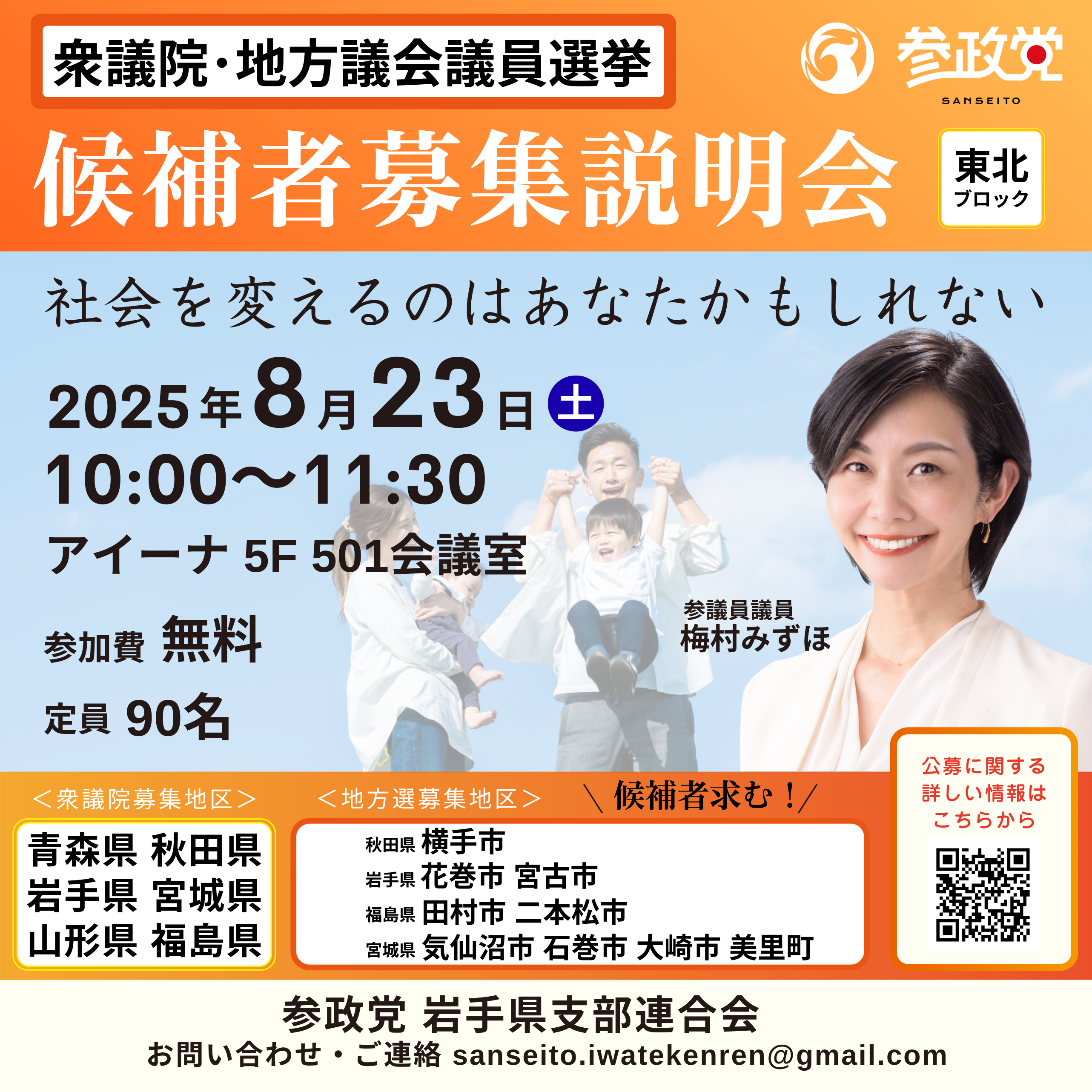 参政党岩手県支部連合会 県連大会 時間:15:30~16:30 場所:いわて県民情報交流センター アイーナ |
