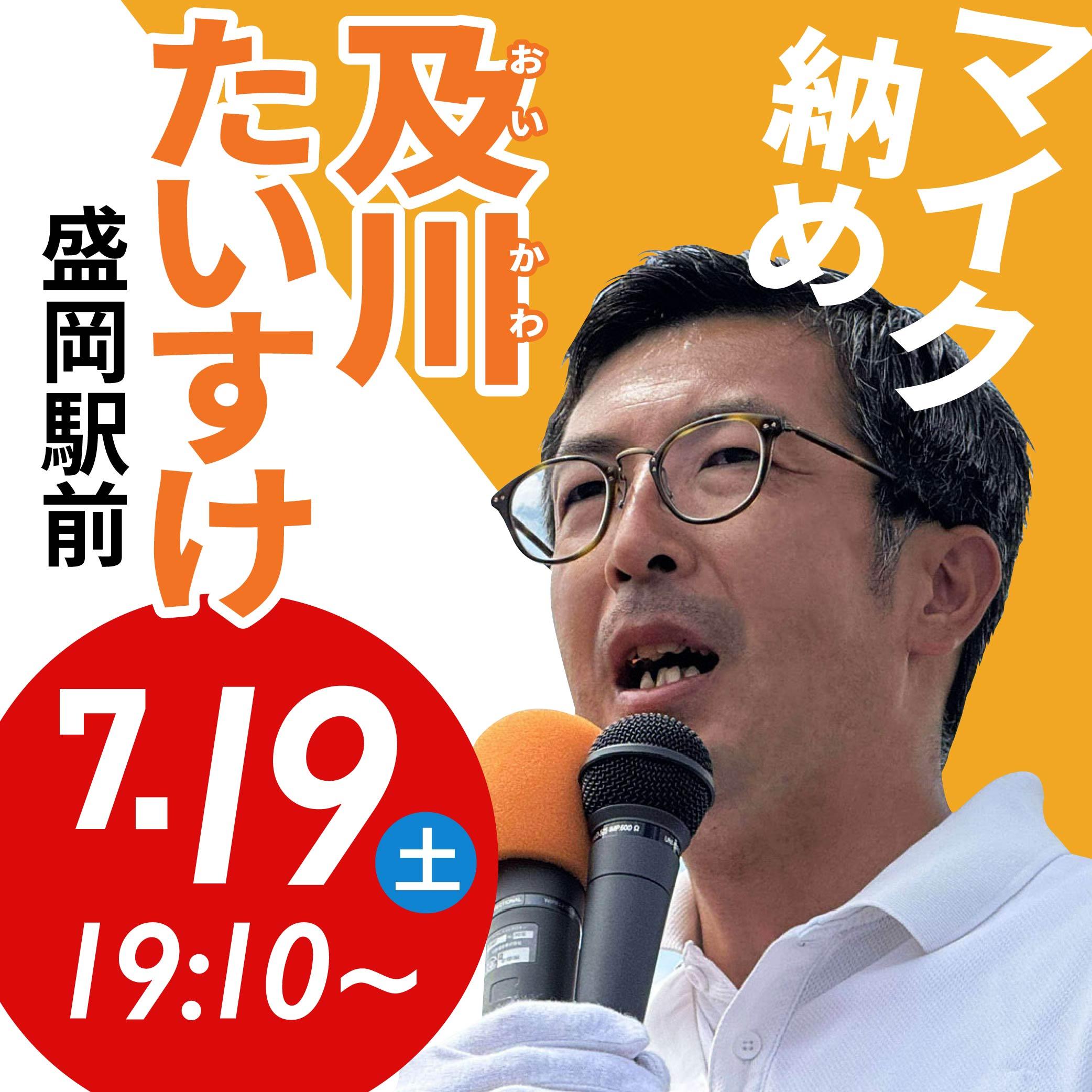街頭演説(マイク納め) 19:10~ 会場:盛岡駅前 弁士:及川たいすけ(岩手選挙区参議院議員候補)、岩手県議員団 |