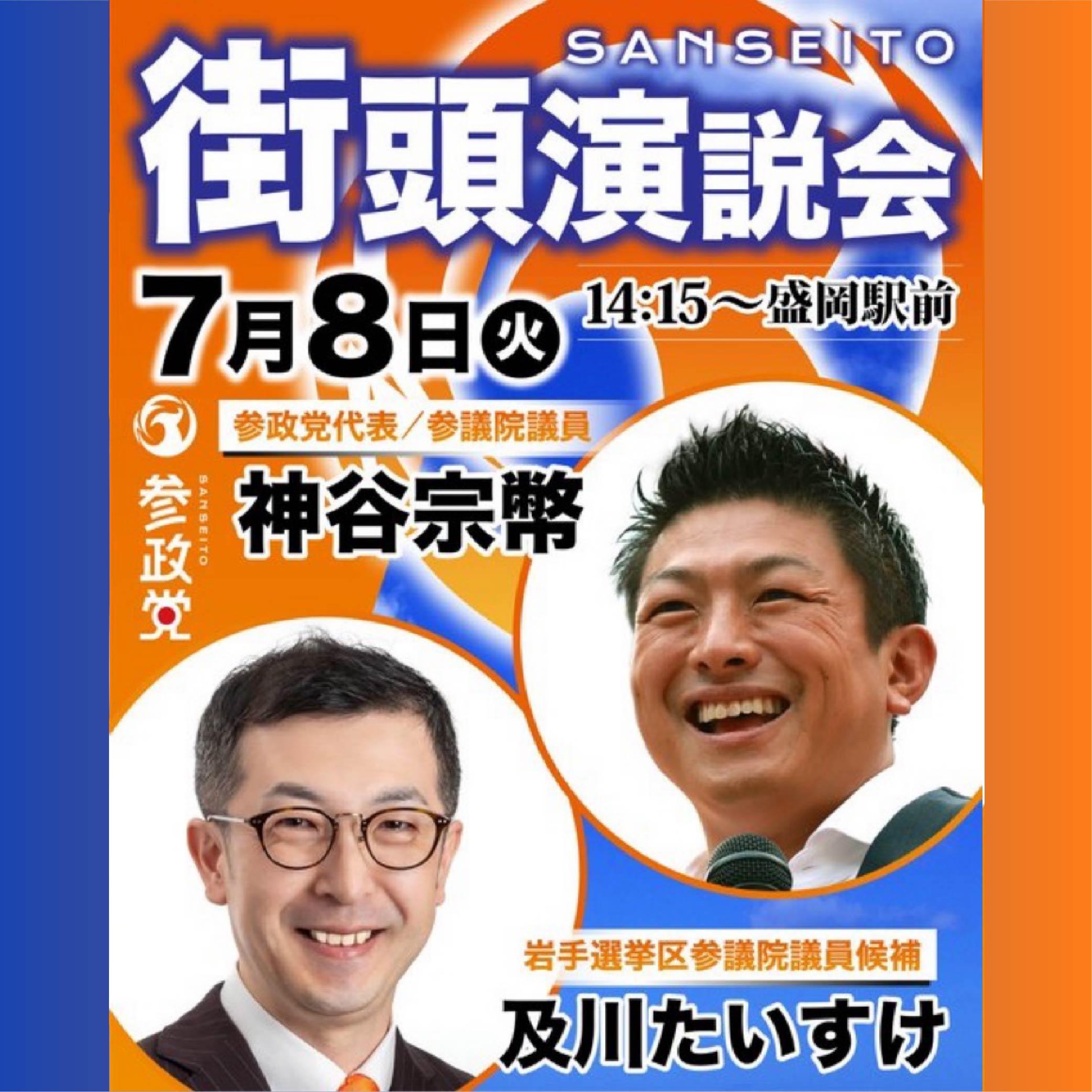 9.14(土) | 神谷宗幣街頭演説会 時間:15:15~16:45 場所:岩手産業会館前(産ビル) |