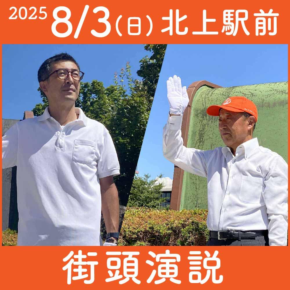 街頭演説 13:00~ 会場:北上駅前 弁士:髙橋はじめ、及川たいすけ |