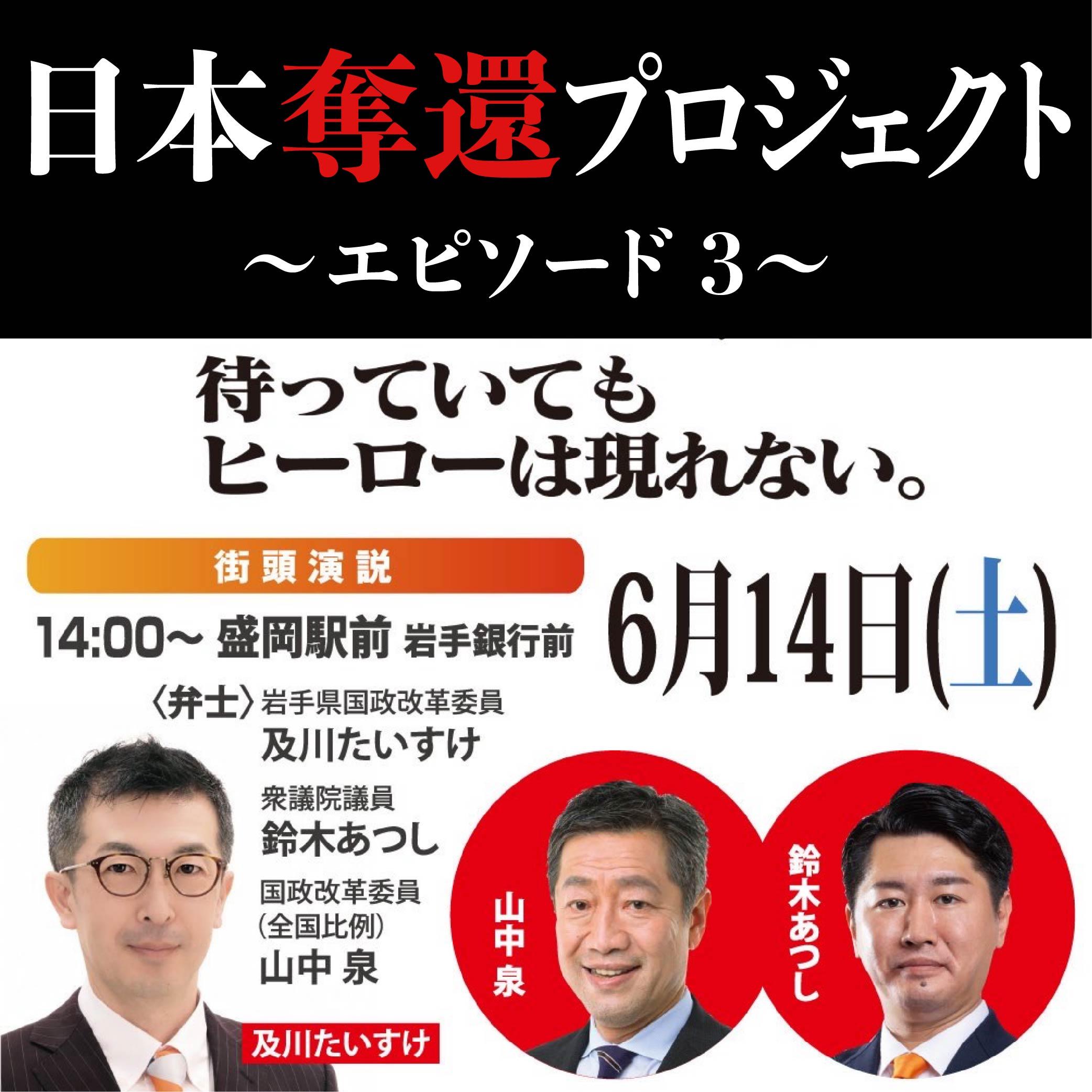 街頭演説 14:00~ 会場:盛岡駅前 弁士:及川たいすけ(岩手県国政改革委員)、山中泉(国政改革委員(全国比例))、鈴木あつし(衆議院議員) |