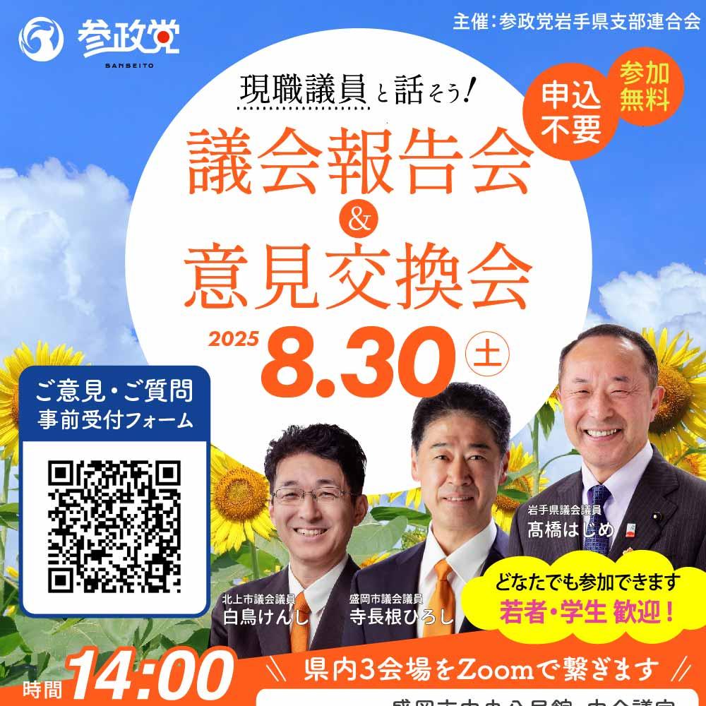 議会報告会&意見交換会 14:00~17:00 会場:盛岡市中央公民館、一関市民センター、シーパル大船渡 |